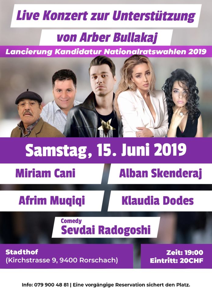 Të shtunën, më 15 qershor 2019 në Stadthof, Kirchstrasse 9, 9400 Rochschach, duke filluar nga ora 19:00, përmes një koncerti festiv dhe nje tryeze diskutimi me pjesëmarrës/e prominet/e, nis fushata e kandidatit shqiptaro-zviceran – Arbër Bullakajt për Paramentin Nacional të Zvicrës 2019. Ftoheni të merrni pjesë në shenje të perkrahjeje dhe mbeshtetjeje për kandidatit tonë favorit për zgjedhjet e 20 tetorit 2019.