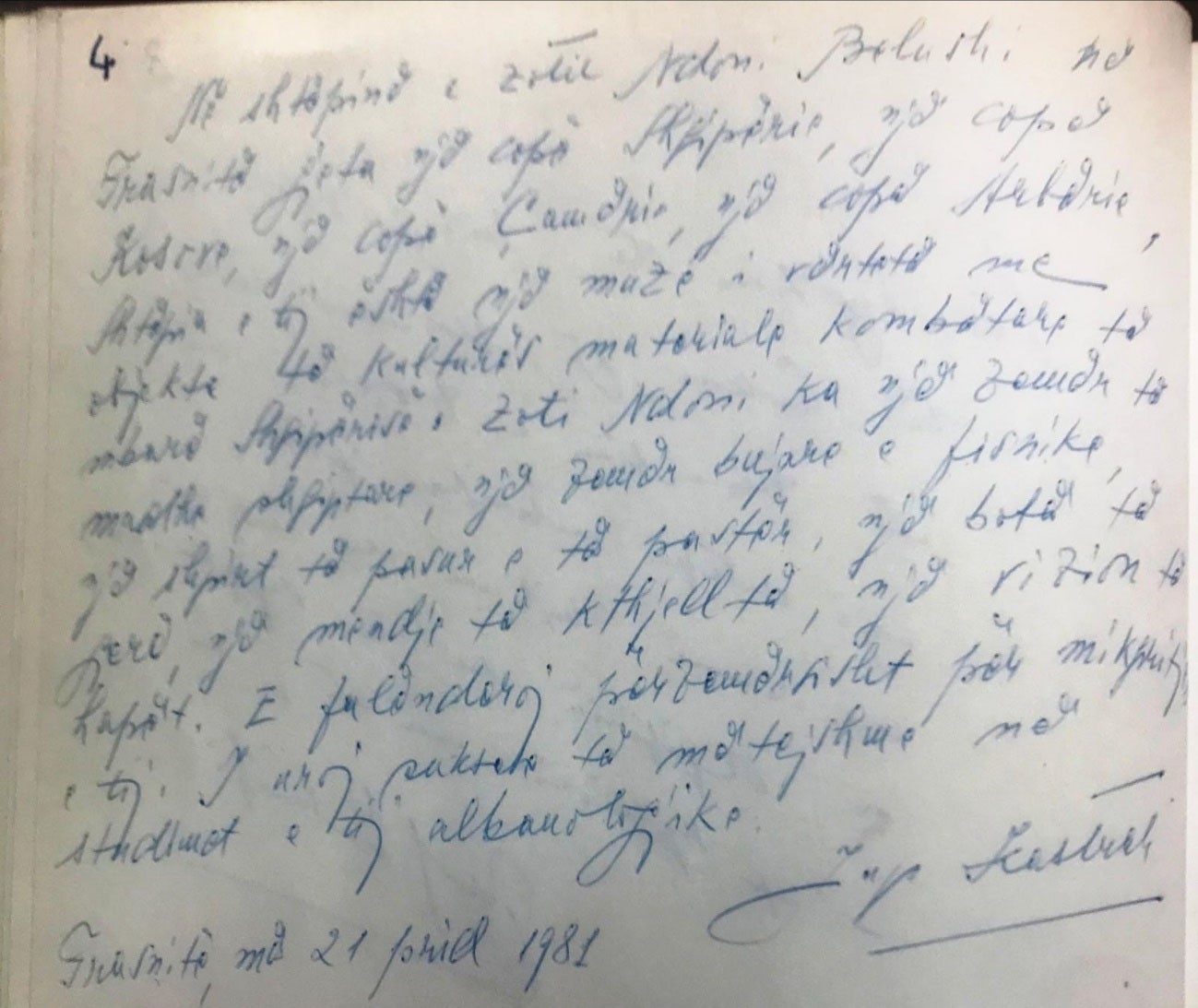 Mbishkrimi i prof Jup Kastarti në librin e bibliotekës, mbi At Bellusci