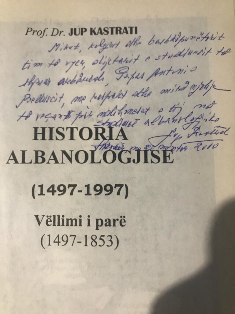 Shumë emocionuese ishte promovimi i veprës së tij Historia e Albanologjisë(1497-1853). Isha atje dhe mora pjesë. Është një vepër kolosale. Ka diçka në veprat e mikut tim Jupi, sepse të gjitha janë të fuqishme, janë shkencore, janë monumentale. Kujtoj që më bëri edhe një dedikim. E ruaj në bibliotekë. Janë shenja që nuk i fshin asnjë kohë. Do të rrojnë me gjuhën, sepse gjuha arbërore nuk vdes kurrë! Dua të shtoj që në bibliotekë ruaj edhe “Historia e Gramatologjisë shqiptare 1635-1944”