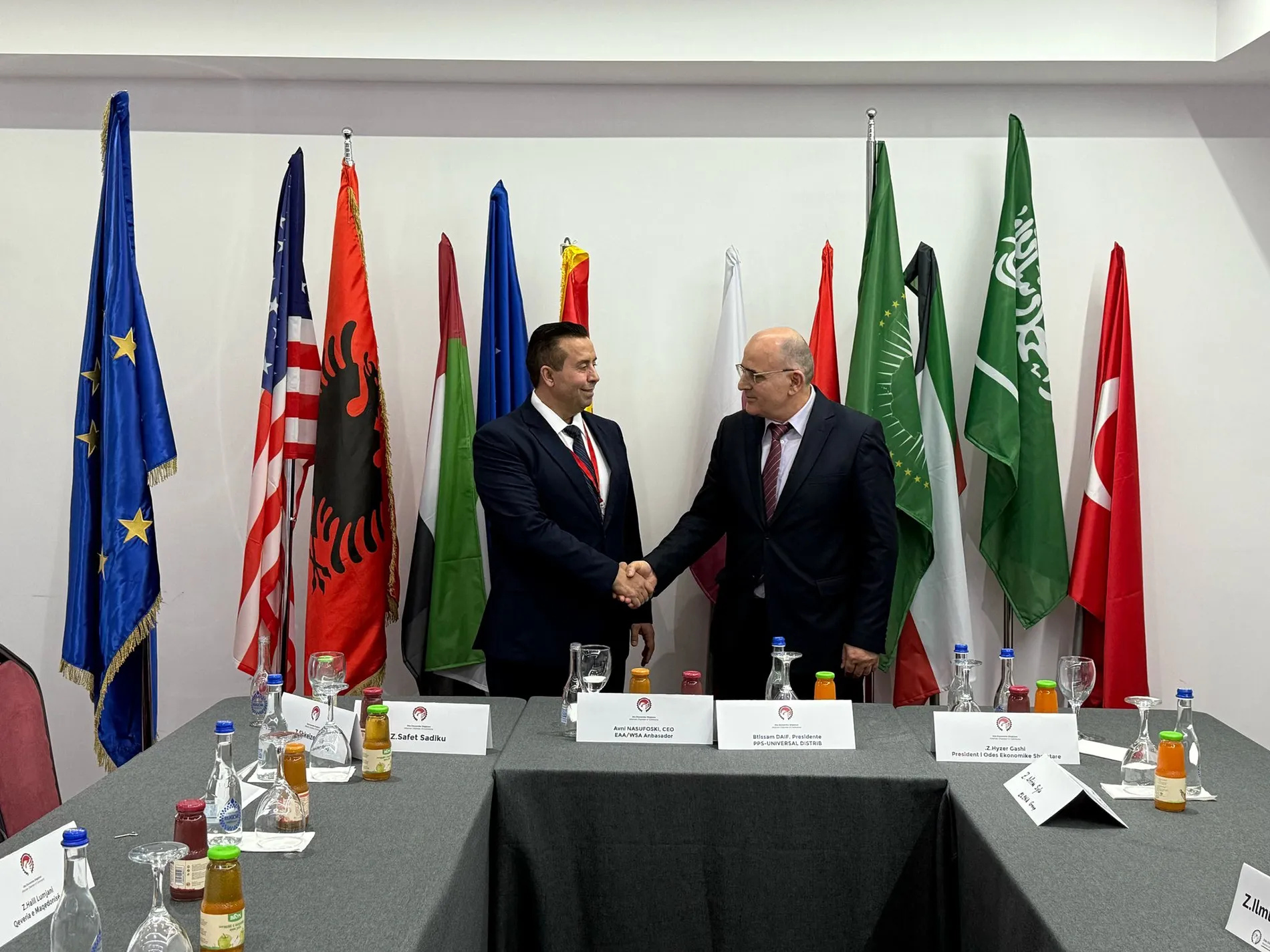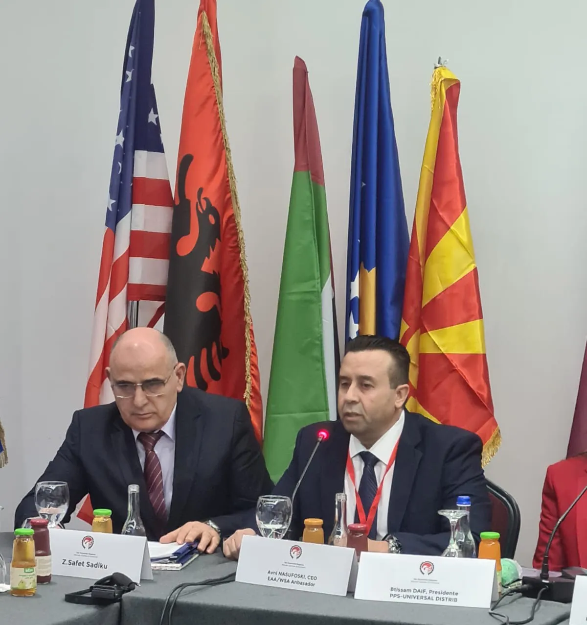 Foto e realizuar në Prishtinë pas mbarimit të Konferencës: (A. Nasufoski dhe S. Sadiku) Kjo foto paraqet një moment zyrtar takimi. Të rrethuar nga flamuj të shumë vendeve, si flamuri i BE-së, SHBA-së, Shqipërisë, Arabisë Saudite, Turqisë dhe të tjerë. Ky imazh reflekton profesionalizëm, diplomaci dhe përpjekje për ndërtimin e marrëdhënieve ndërkombëtare. Duket se është një ngjarje me rëndësi ekonomike. Duke qenë se kjo ishte pas një konference në Kosovë,prania e shumë flamujve nga vende të ndryshme dhe organizata ndërkombëtare nënkupton që konferenca ka pasur karakter ndërkombëtar. Të sqaroj me këtë raast se z. Avni Nasufoski te të gjitha koto vende ka lobuar për njohjen e Kosovës në mënyrë aktive dhe të pavarur.