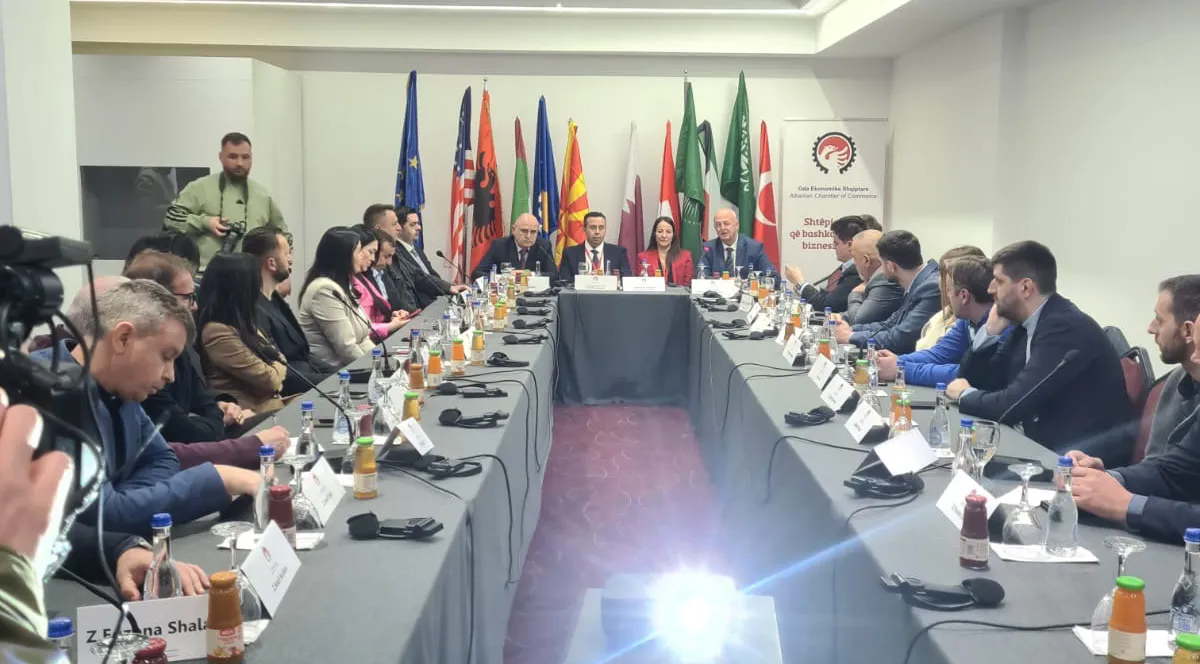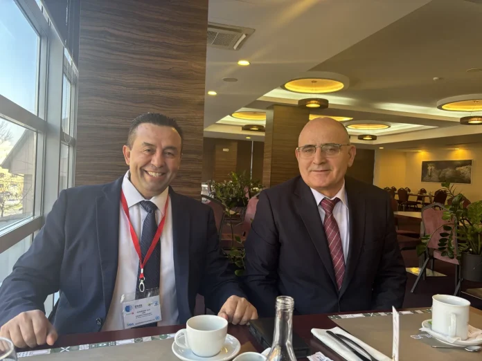 Kjo foto kap një moment miqësor dhe profesional midis Avni Nasufoskit dhe Safet Sadikut, të realizuar në Tiranë para fillimit të një konference ekonomike.