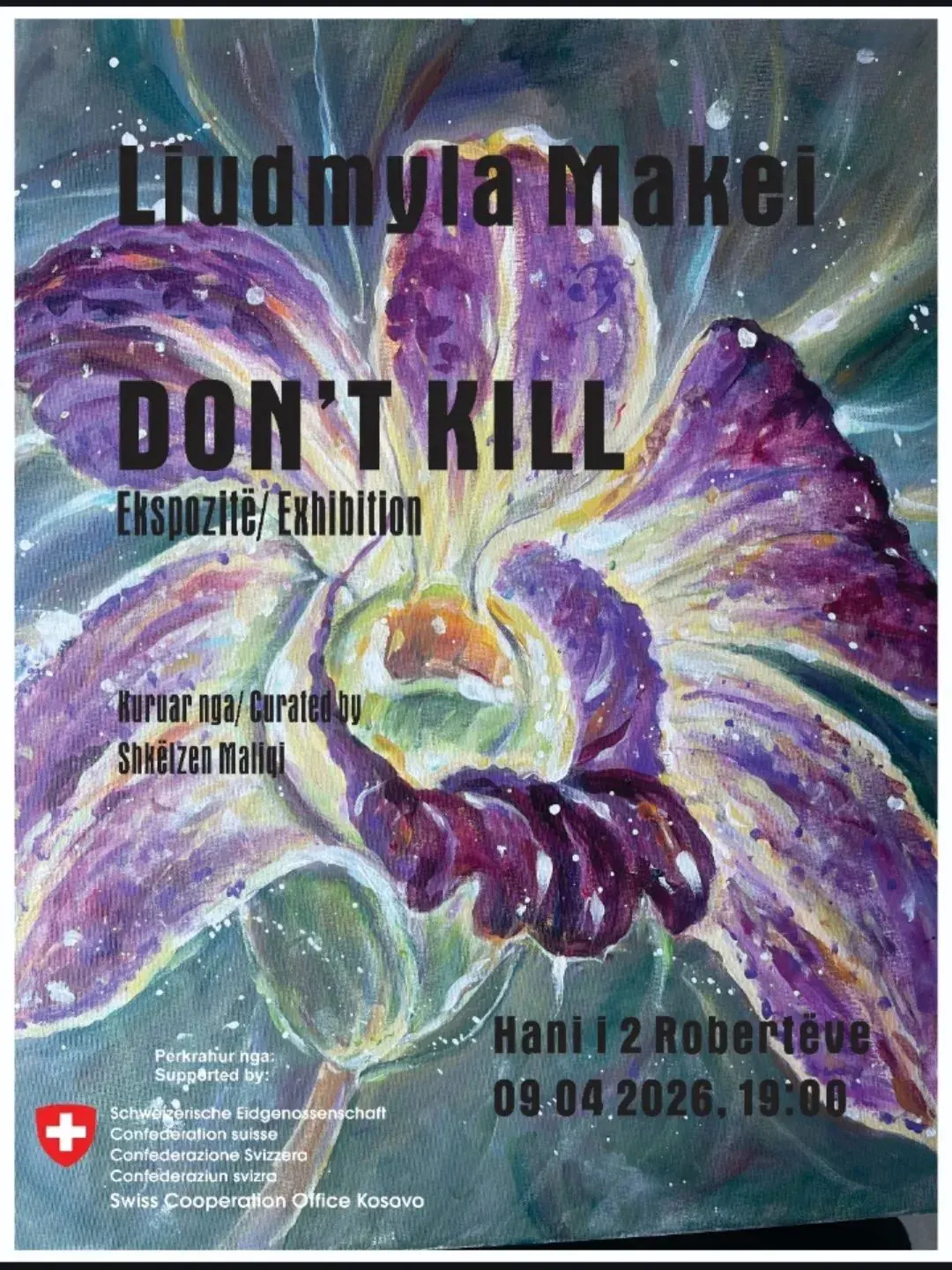 U hap ekspozita personale e artistes autodidakte nga Ukraina, Lyudmyla Makey, më 9 prill 2026, në hapësirën e “Hani i 2 Robertëve” në Prishtinë një hapje që solli në qytet një univers të butë ngjyrash, kujtese dhe rrënjësh të zhvendosura.Në këtë ekspozitë me titull “Don’t kill” u prezantuan piktura të punuara me një delikatesë të jashtëzakonshme, ku lulja nuk është vetëm motiv dekorativ, por një gjuhë e plotë emocionale. Petalet, degët dhe ritmet florale shpërndahen si kujtime që nuk zbehen, si shenja të një bote që vazhdon të jetojë përmes dorës së artistes. Krahas tyre, u shfaqën edhe figura femërore të veshura me kostume tradicionale ukrainase, të cilat mbajnë brenda vetes dinjitetin e një kulture që mbijeton mes ndryshimit dhe largësisë. Ngjyra të ndezura të lehta, me ca kontraste të holla por estetike, të përfituara në një shkallë emocionese qëndronin butësisht mbi petalet e luleve.