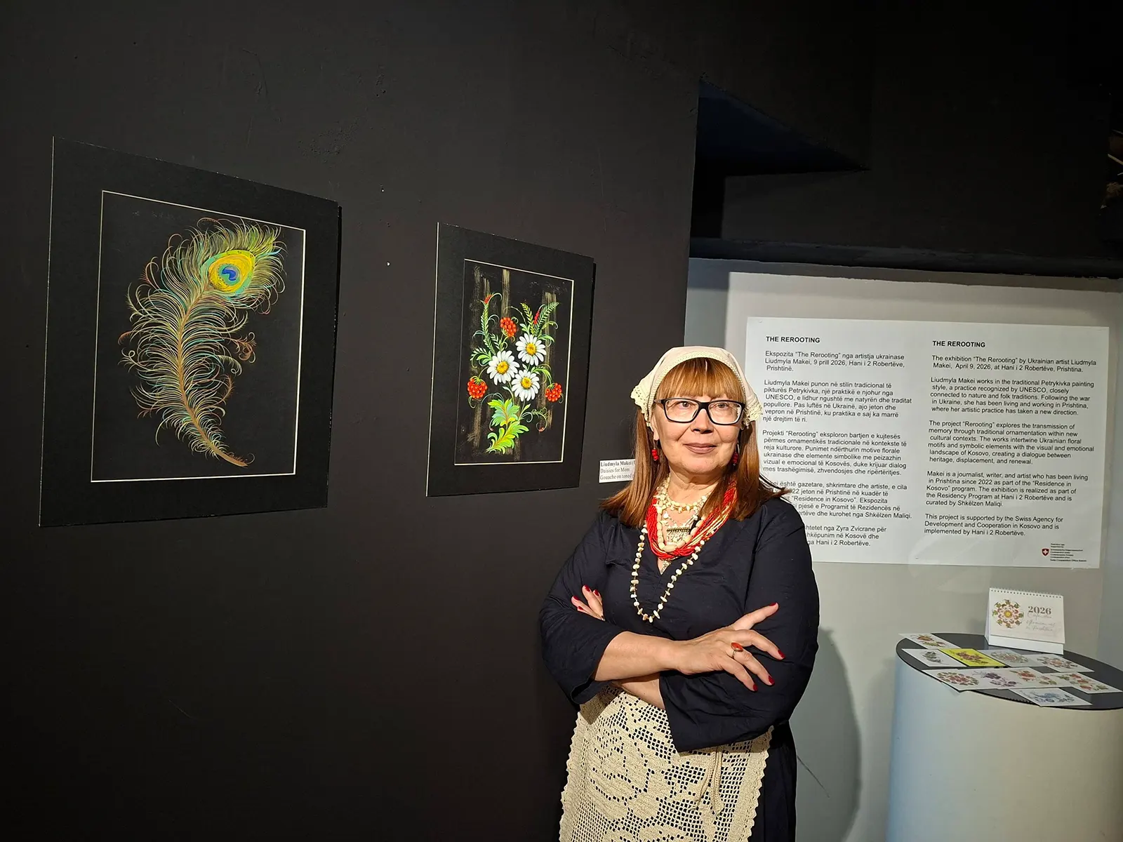 E njohur për praktikën e saj në stilin tradicional të pikturës Petrykivka një trashëgimi vizuale e mbrojtur nga UNESCO dhe e lidhur ngushtë me natyrën dhe folklorin Makey e rimendon këtë gjuhë ornamentale në një kontekst të ri jetësor. Pas shpërthimit të luftës në Ukrainë, ajo jeton dhe vepron në Prishtinë, ku arti i saj ka marrë një drejtim të ri, më të brishtë dhe njëkohësisht më të fortë. Projekti “Rerooting” shndërrohet kështu në një akt poetik të mbjelljes së kujtesës në tokë të huaj, një përpjekje për të lidhur fragmente të identitetit të shpërndarë përmes ornamentikës tradicionale. Motivet florale ukrainase ndërthuren me një ndjeshmëri të re vizuale, duke u takuar me peizazhin emocional të Kosovës si dy toka që flasin me njëra-tjetrën përmes heshtjes, ngjyrës dhe plagës së përbashkët të historisë.