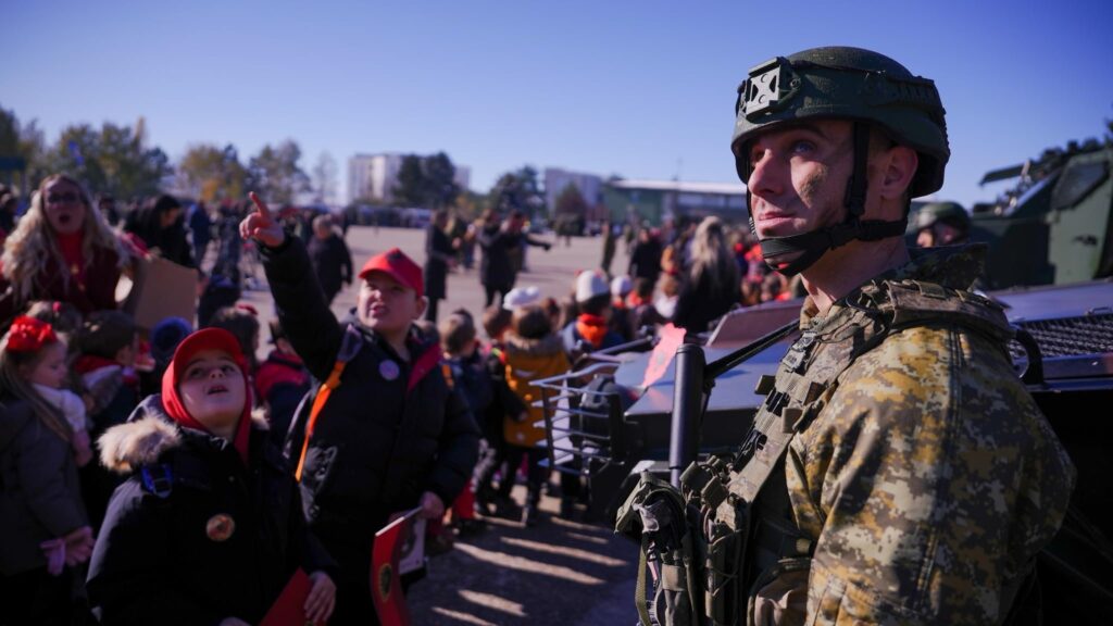 1. Një pjesëtar i Forcës së Sigurisë së Kosovës i rrethuar nga fëmijë të veshur me uniforma.