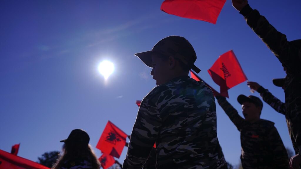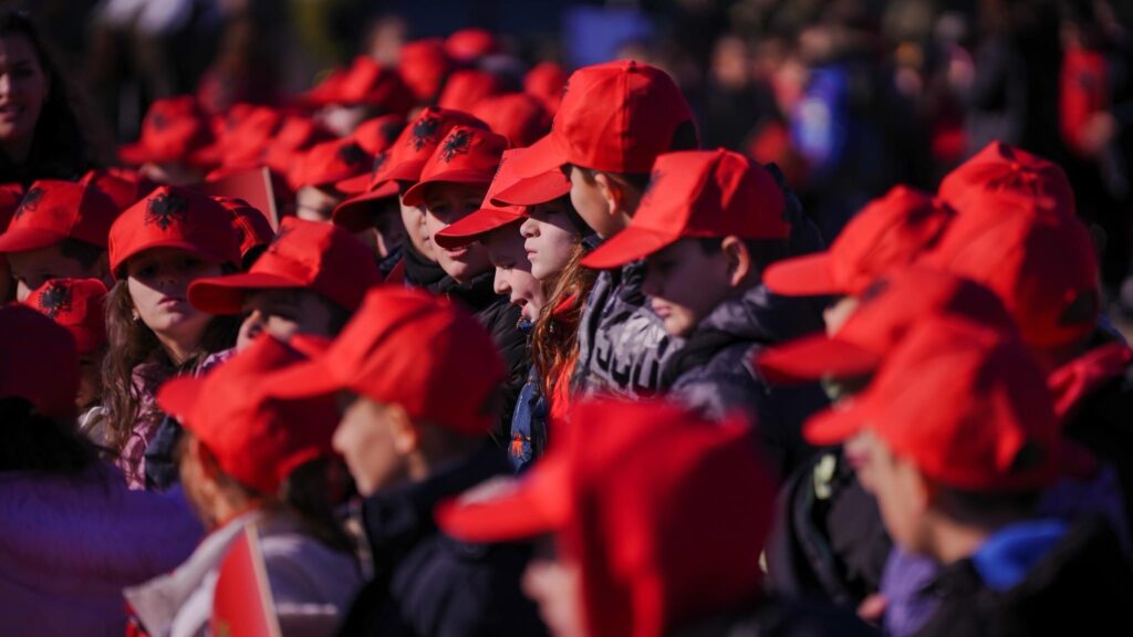 2. Një grup fëmijësh me kapela me flamurin kombëtar shqiptar.