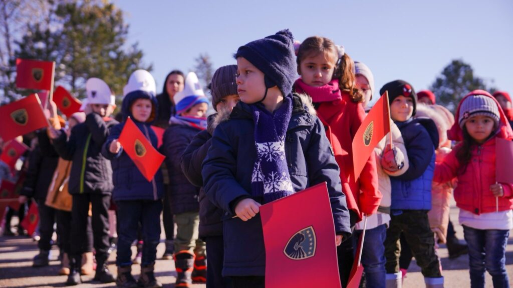 3. Flamuj me stema të Forcës së Sigurisë së Kosovës mbanin në dorë këta fëmijë që kishin ardhur të organizuar për të parë nga afër ushtarët.
