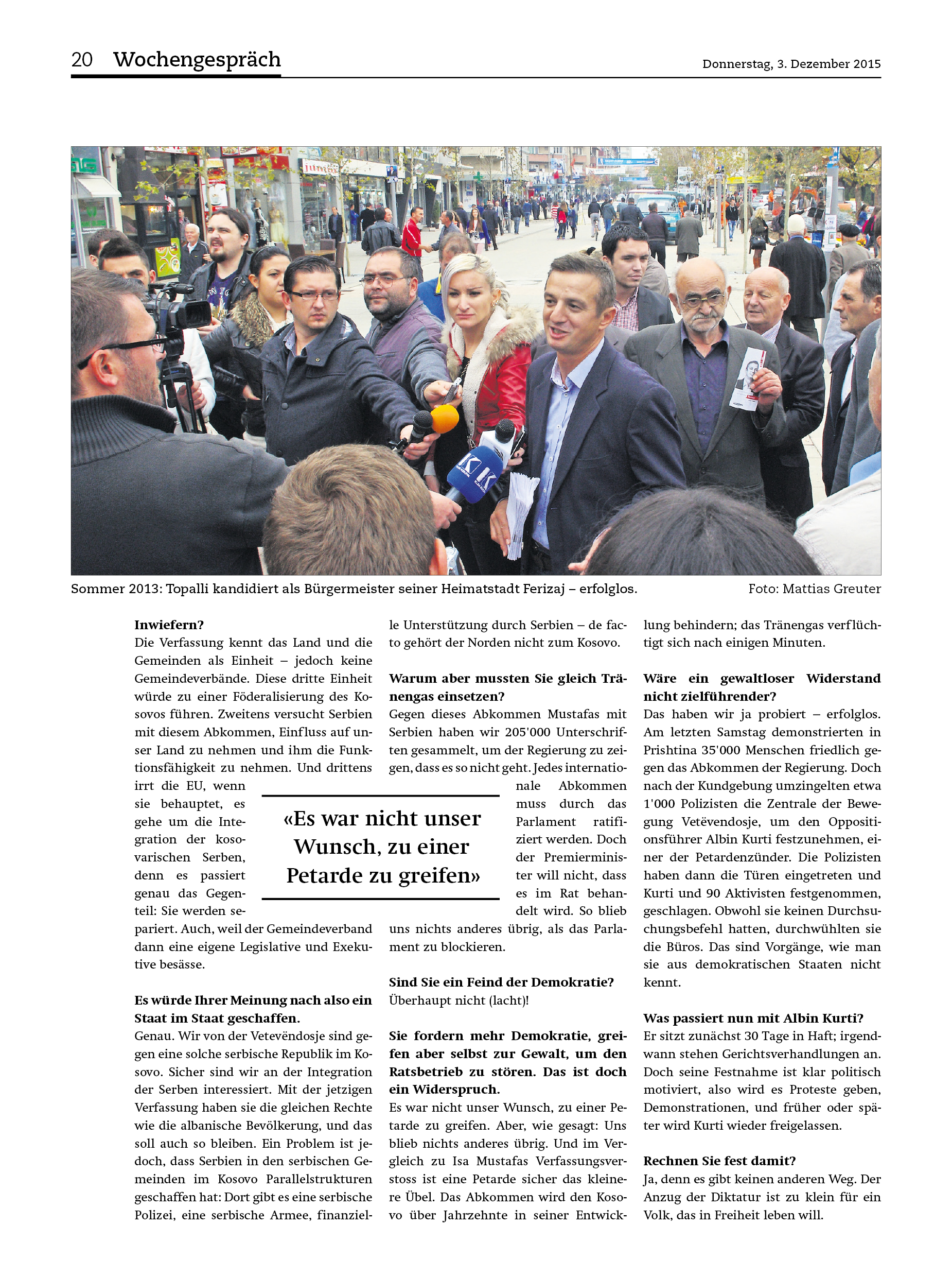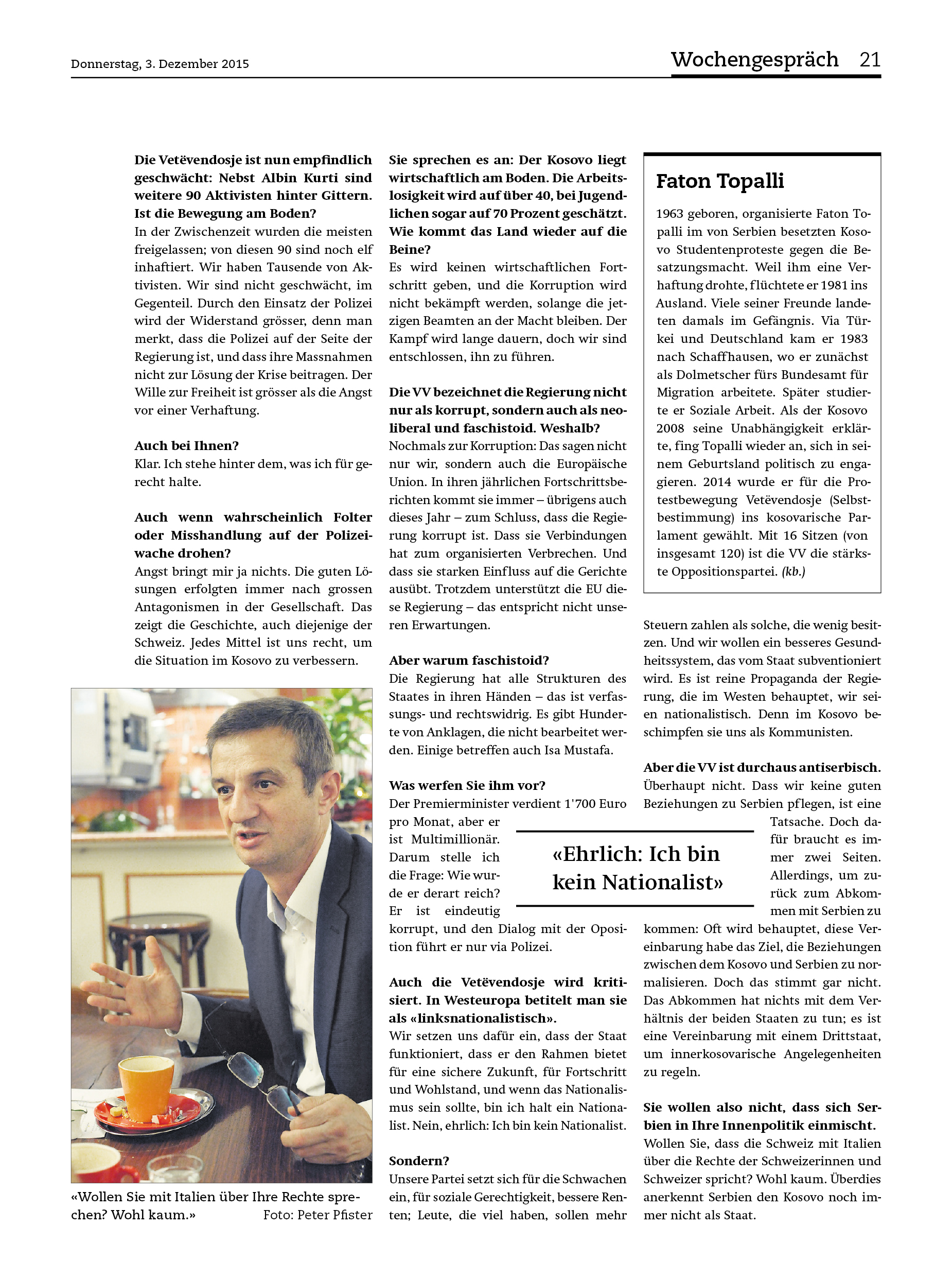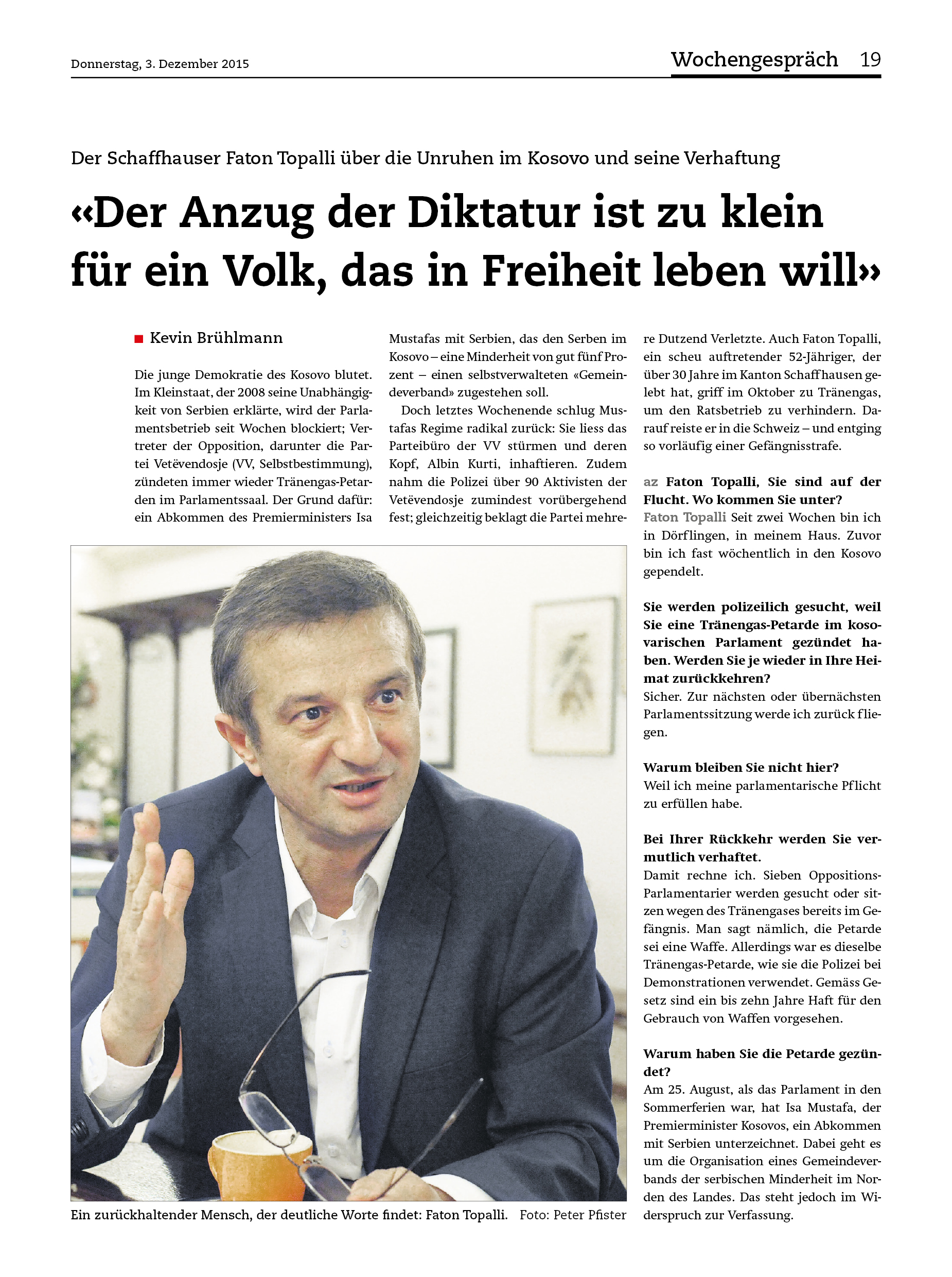 «Faton Topalli 1963 geboren, organisierte Faton To­palli im von Serbien besetzten Koso­vo Studentenproteste gegen die Be­satzungsmacht. Weil ihm eine Ver­haftung drohte, flüchtete er 1981 ins Ausland. Viele seiner Freunde lande­ten damals im Gefängnis. Via Tür­kei und Deutschland kam er 1983 nach Schaffhausen, wo er zunächst als Dolmetscher fürs Bundesamt für Migration arbeitete. Später studier­te er Soziale Arbeit. Als der Kosovo 2008 seine Unabhängigkeit erklär­te, fing Topalli wieder an, sich in sei­nem Geburtsland politisch zu enga­gieren. 2014 wurde er für die Pro­testbewegung Vetëvendosje (Selbst­bestimmung) ins kosovarische Par­lament gewählt. Mit 16 Sitzen (von insgesamt 120) ist die VV die stärks­te Oppositionspartei. (kb.)»