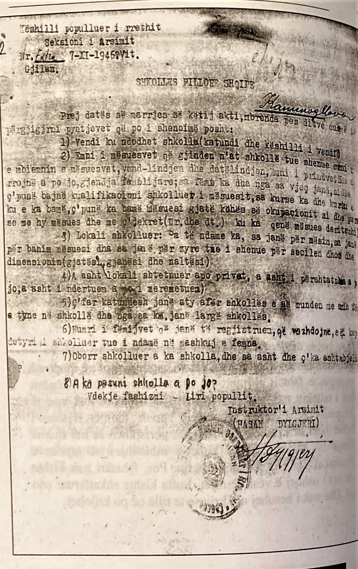 Hasan Dylgjeri, në maj 1945 caktohet organizator dhe përgjegjës kryesor për hapjen e shkollave shqipe, ndërsa në vitin 1947 emërohet inspektor arsimi dhe me të marr detyrën e Eprorit të arsimit për Kosovën, për pikëpamjet e tij përparimtare burgoset nga UDB Jugosllave nga viti 1949 -1955, shumicën e të cilave i kalon në Goli Otokun famëkeq.