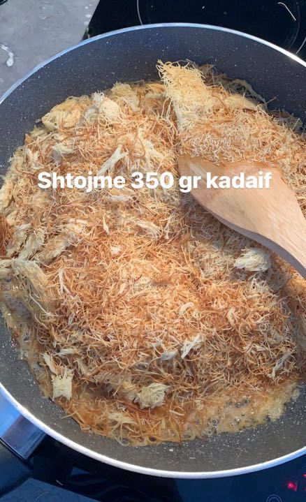 Në tigan hedhim gjalpin dhe sheqerin. Pasi të fillojnë të karamelizohen shtojmë kadaifin. Përziejmë mirë në mënyrë që kadaifi të piqet njejtë. Pastaj shtojmë arrat të cilat i kemi bluar në mikser. Kur e shohim se e kemi gati, ndalojmë zjarrin dhe gjysmën e kadaifit e hedhim në tepsi duke e shtypur mirë me dorë.