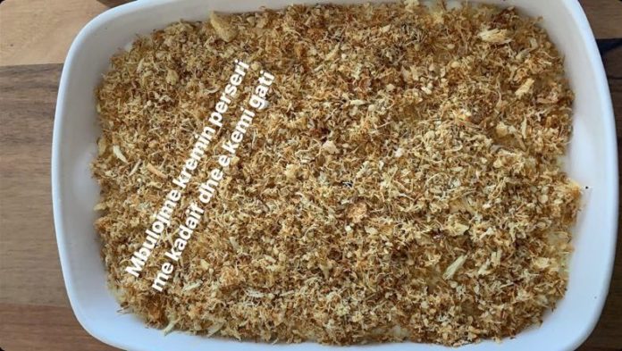 Përgatisim kremin me përbërësit e përmendur më lartë, i ziejmë derisa të fillojmë një masë të dendur. Këtë masë e shtojmë sipër kadaifit. Përmbi kremin hedhim përsëri kadaifin e mbetur duke u mbulur komplet sipërfaqen e kremit.