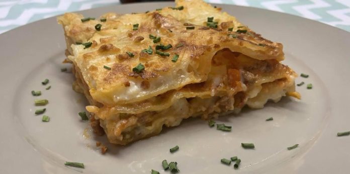 Në tiganin e lyer me gjalpë, hedhim një lugë nga masa me mish të bluar. Më pas shtrojmë një rend me peta lazanje, pastaj përsëri sipër masën me mish, mbi masën me mish shtojmë beshamel sosin dhe kështu vazhdojmë deri në petët e fundit. Në të fundit rend fare, hedhim vetëm beshamel sos dhe mbulojmë me djathë parmesan.