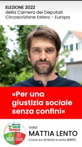 Prointerga.ch mbështet kandidaturën e bashkëpunëtorit dhe mikut tonë Mattia Lento. Me rastin e kandidaturës, në një prononcim për portalin tonë dhe komunitetin shqiptaro-zviceran ai theksoi: “Kandidojë për Sinistra italiana / Europaverde (Evropa e gjelbër) për Kuvend në zonën elektorale Evropa. Ne zgjedhim 3 euro-deputetë në Evropë: kemi shanse për vendin e tretë (njëri shkon qartë për PD-në, e cila është aleate me ne në Itali kundër së djathtës), një në të djathtë (post-fashistët, Lega dhe Berlusconi) dhe i ulësja e tretë. është ende e hapur se kush do ta fitojë. Në Senat zgjedhim vetëm një deputet, ndaj nuk bëmë listë për të mos favorizuar të djathtën (ne mbështesim listën e PD). Të gjithë të rriturit që jetojnë jashtë Italisë dhe në një vend evropian dhe me pasaportë italiane janë votues të mundshëm. Fletët e votimit me të gjitha të dhënat për votim jashtë vendit do të mbërrijnë me postë në fillim të shtatorit.”
