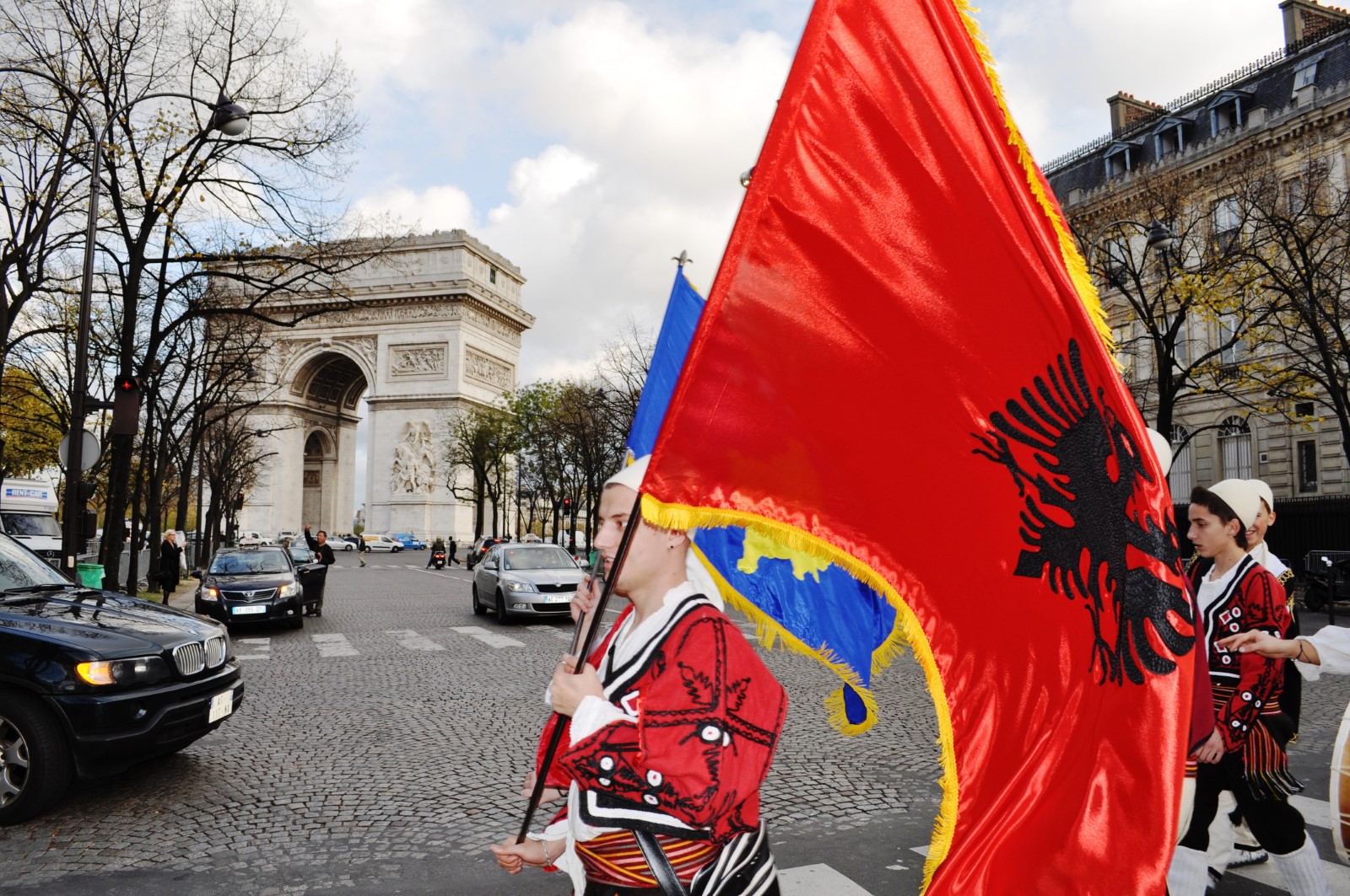 Legj.1) Shqiptarët me flamuj duke parakaluar pranë portës triumfale të Parisit