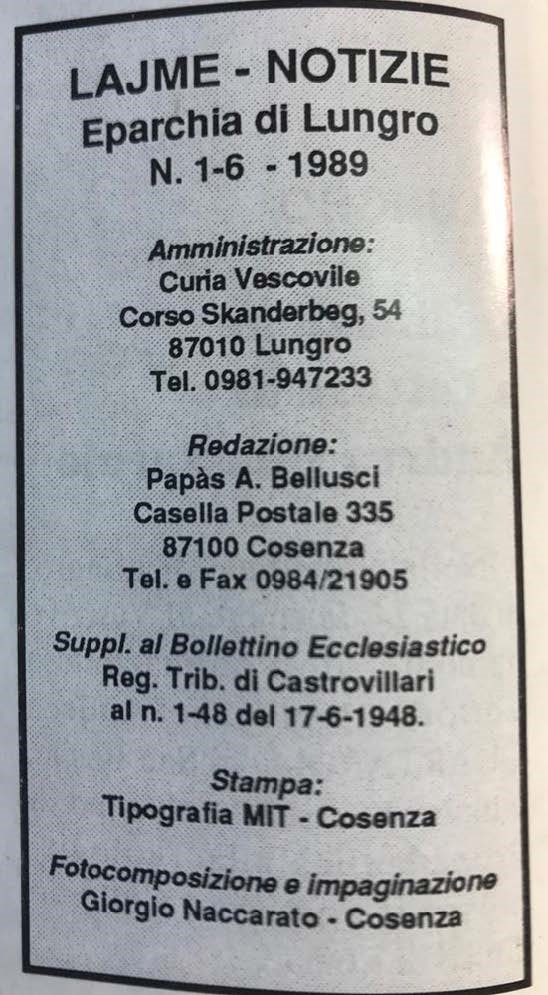 Më vonë pas vdekjes së Stamatit, një tjetër Peshkop u vendos në Ungëra i quajtur Lupinacci, i cili kishte kryer nga misionin e tij pranë në Eparkinën e Horës së Arbëreshëvet në Sicili, dhe kthyer në Kalabri. Në Sicili Lupinacci ishte ndeshur me revistën” Fjala e tim Zot”, dhe tani në Kalabri së bashku me AT Belluscin themeluan në 1989 Revistën dy gjuhësh Lajme – Notizie.