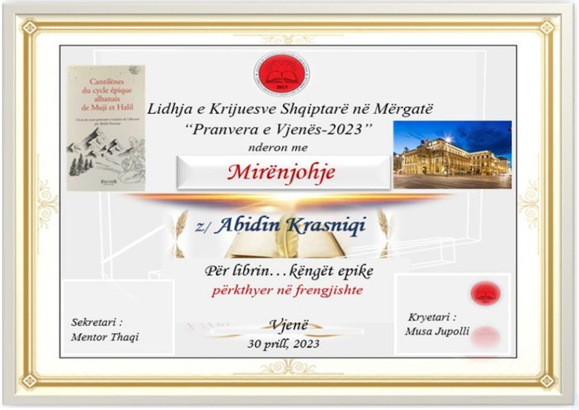 Tani më emri i autorit dhe përkthyesit të ri Abidin Krasniqit, që jeton dhe vepron në Paris prej vitesh nuk është i panjohur. Pas botimit të librit tij të parë, përkthimit në frëngjisht të kryeveprës së Fishtës “Lahuta e Malësisë, (në vitin 2019) Abedini vjen edhe librin tjetër po ashtu me rëndësi të veçantë për opinion frankofane, libër ky që i kushtohet eposit të kreshnikëve shqiptar.