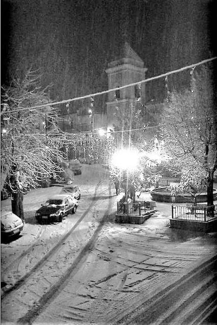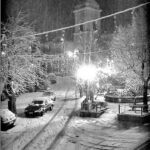Sheshi Skënderbe, Villa Comunale, Campanile della Chiesa San Giovanni Battista, innevate, riprese da Via Roma da Maria Kakishe.