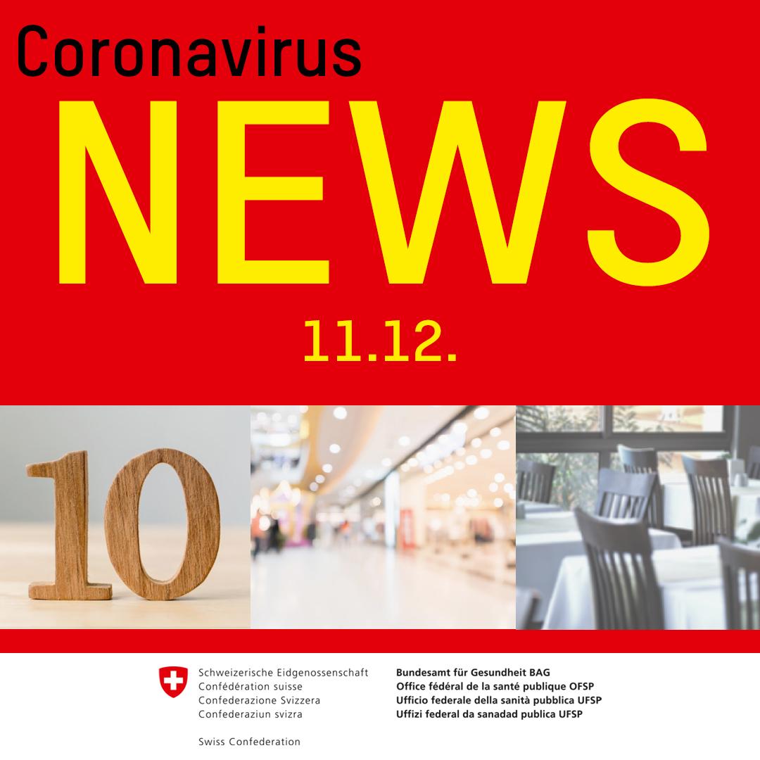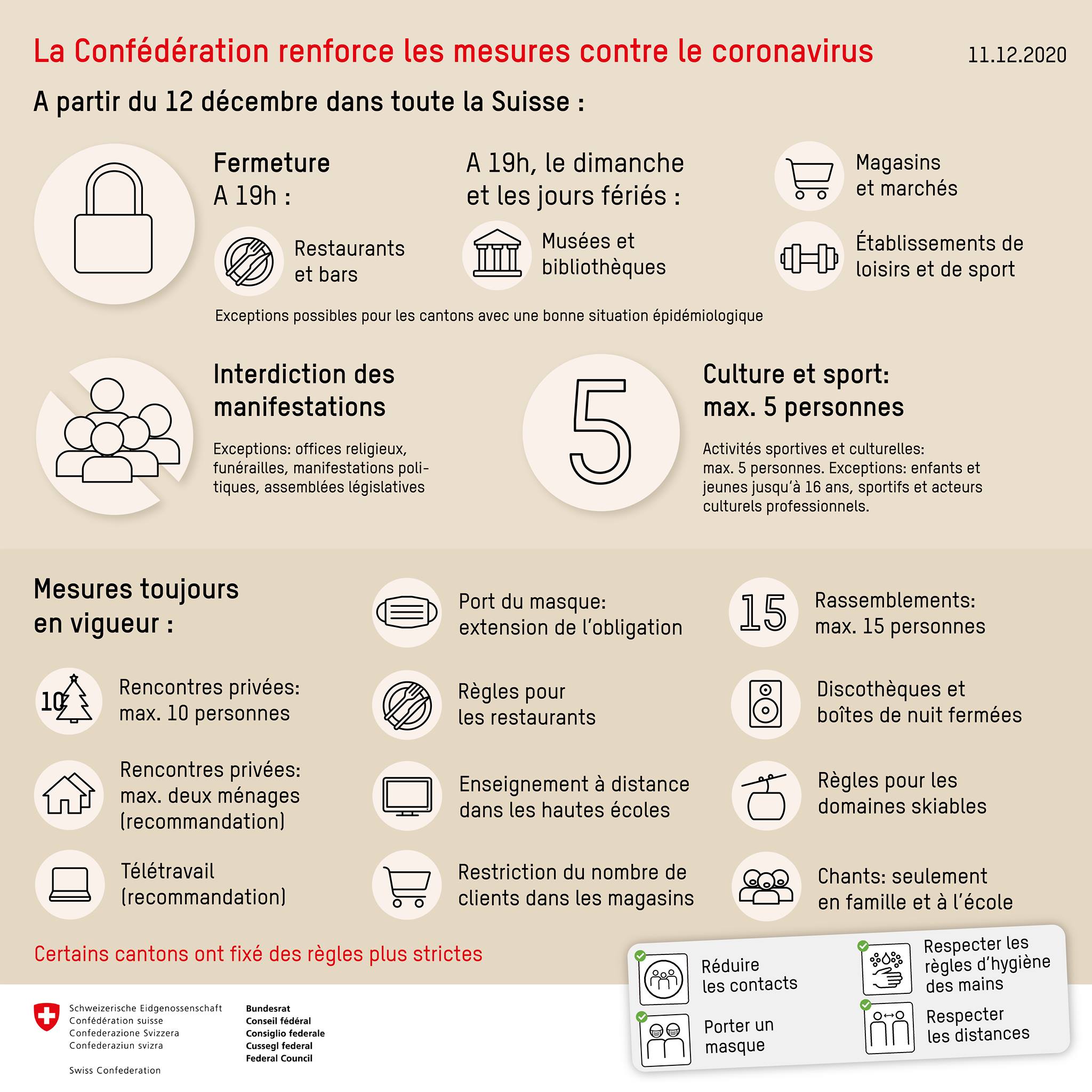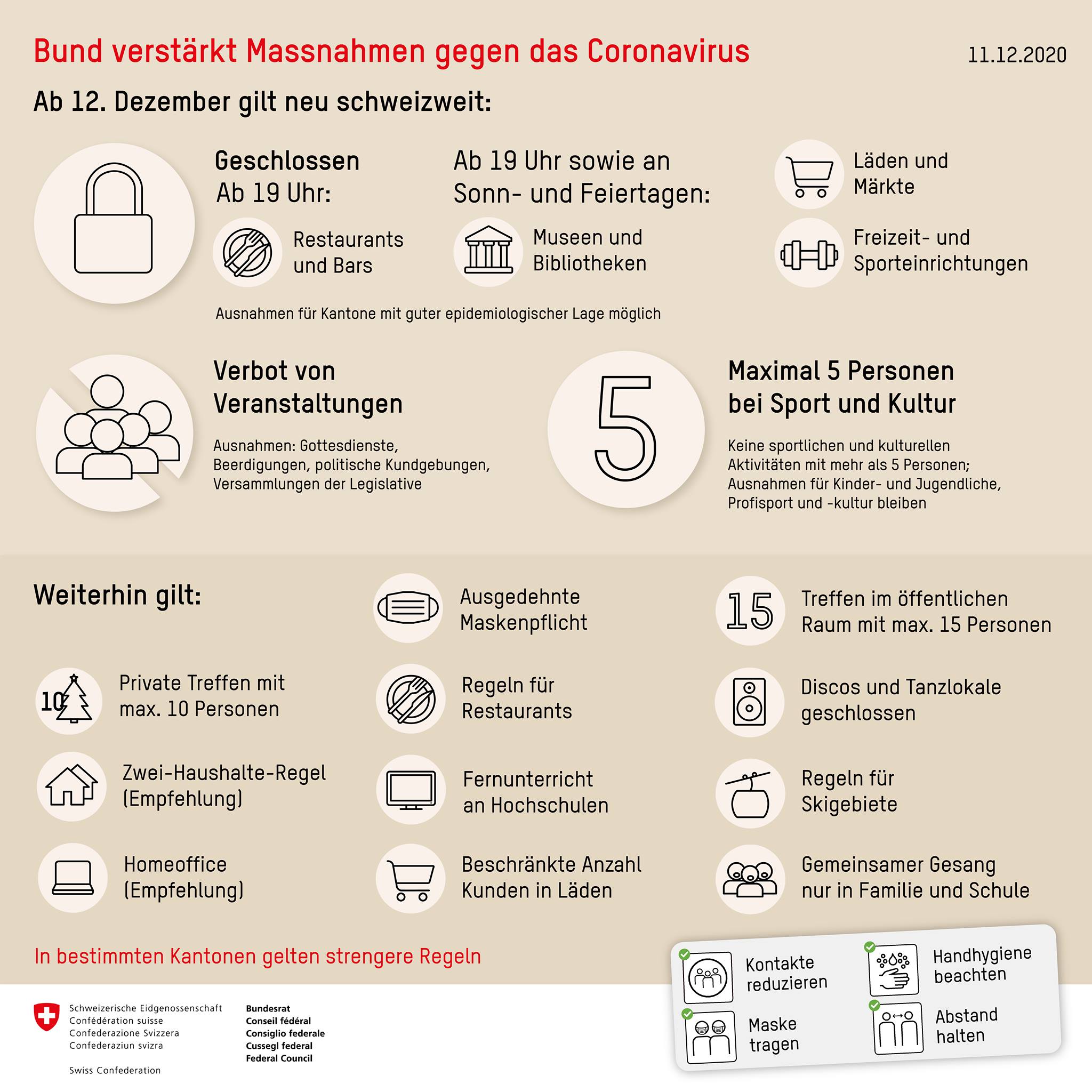 Për restorantet dhe baret, dyqanet dhe tregjet, muzetë dhe bibliotekat si dhe objektet sportive e të kohës së lirë, do të ketë një ndalim pune nga ora 19 e ditës së shtunë të 12.12.2020. Me përjashtim të restoranteve dhe bareve, të lartëpërmendura duhet të qëndrojnë të mbyllura edhe të dielave dhe festave zyrtare. Kantonet me zhvillime të favorshme epidemiologjike mund të zgjasin ndalesën deri në orën 23:00. Manifestimet e tubimet janë të ndaluara me përjashtime të caktuara, aktivitetet sportive dhe kulturore lejohen vetëm në grupe me deri në pesë persona.