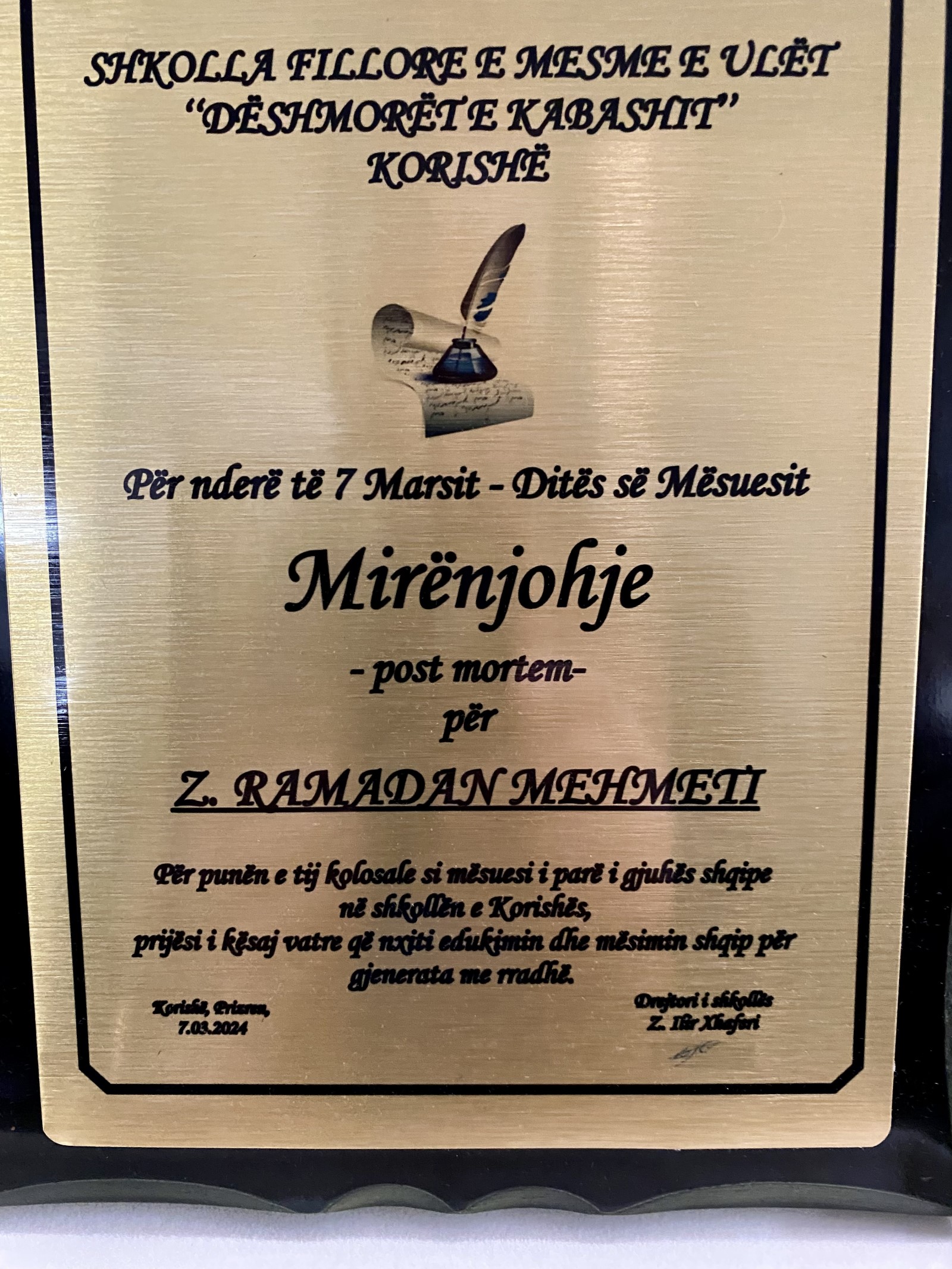 Kur kishin kaluar mbi 80 sa vite nga puna vetëmohuese e mësuesit Ramadan Mehmetaj në Korishë, mora një telefonatë prej Tirane nga e bija e tij Afërdita, e cila më tha se kishte përcjell një fejton timin për mësuesit nga Shqipëria në Kosovë dhe se donte të vizitonte shkollën ku kishte punuar baba i saj , i emëruar mësues në këtë shkollë me dekretin e ministrit Koliqi, dhe se tash në ditën e mësuesit donte të vizitonte shkollën ku kishte punuar babai i saj, ndonëse ajo kishte lind disa vite më vonë. Pasi vura kontakt përmes mërgimtarit të këtij fshati në Zvicër, Sherif Dakajt ai më odroi telefonin mësimdhënësit të kësaj shkolle Latif Dakaj dhe sa kaq erdhi përgjigja për kënaqësinë që shprehte kolektivi për ardhjen e të bijave të mësuesit të parë të shkollës së tyre. Ishte kjo një befasi e këndshme për kolektivin e tashëm arsimor, ndaj edhe vizita u realizua dje më 7 Mars, në ditën e mësuesit, kur Afërdita , vajza e madhe me dy motrat: Marinja dhe Aijana dhe dajën e tyre akademik Driton Spahiun erdhën në Korishë, ku hasën në një mikpritjes shumë të përzemërte, duke shpreh keqardhjen që mësuesi i parë nuk e pati fatin qëtë pres pavarësinë e Kosovës. Me këtë rast drejtori i shkollës Ilir Xhaferi i cili pasi i përshëndeti mysafirët ua d¨rëzoi atyre mirënjohjen pas mortum për mësuesin pishtar e atdhetar, Ramadan Mehmetaj.