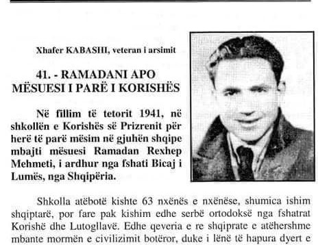 2. Ramadan Mehmetaj, normalisht nga Bicaj, ka punuar mësues i shkollës shqipe në Prizren, në lagjen Bajrakli. Pastaj hapi shkollën shqipe në Korishë.