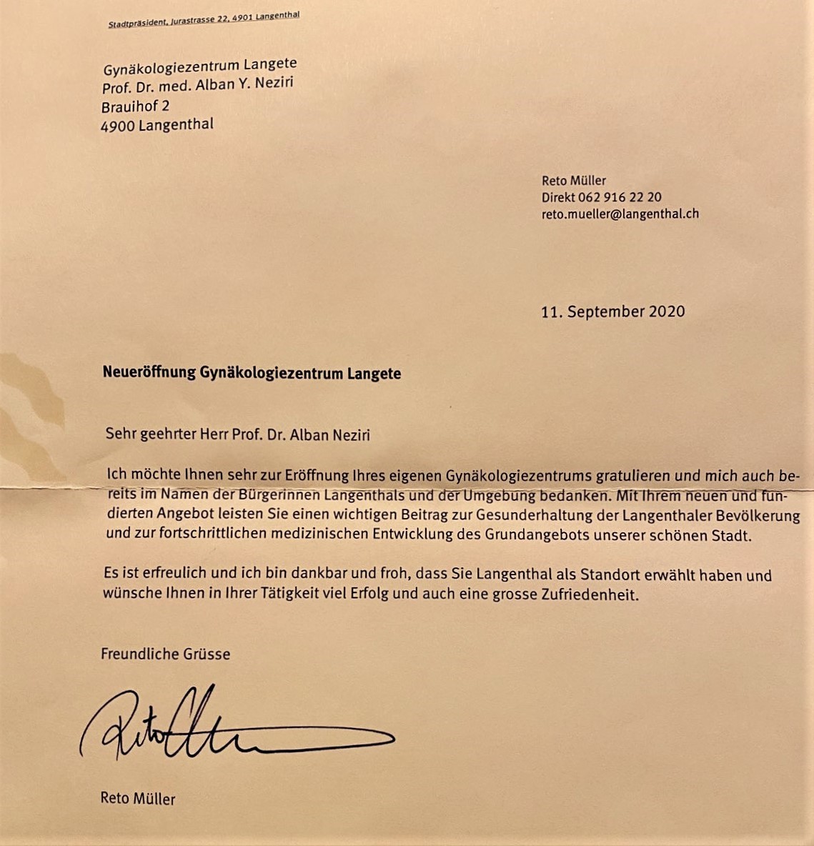 Për personalitetin e këtij mjeku, dhe famën që ka krijuar  jo vetëm te mërgata jonë por edhe në mesin ku jeton, dëshmon edhe ceremonia e hapjes së mbrëmshme të kësaj qendre private gjinekologjike ordinancës në qendër të qytetit të Langenthalit.