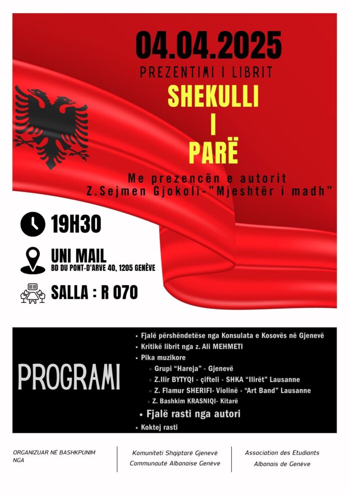 Më 4 prill 2025, në ora 19:30, në sallën R070 të Uni Mail në Gjenevë, Shoqata e Studentëve Shqiptarë në Gjenevë në bashkëpunim me KSHGJ-në do të organizojnë promovimin e librit „Shekulli i Parë“, të autorit Sejmen Gjokoli. Ky aktivitet synon të kontribuojë në ruajtjen dhe promovimin e kulturës dhe historisë shqiptare në diasporë.