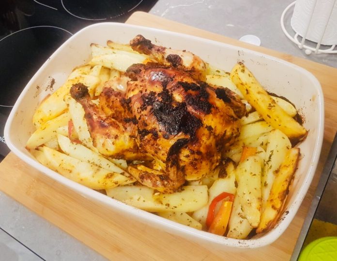 Ndërkohë, qërojmë patatet dhe i presim gjatë, qërojmë edhe karrotën dhe e prejmë si dhe specin e kuq. Këto I hedhim në tavë të cilën më parë e kemi lyer me gjalpë. I shtojmë kripë, piper të zi dhe erëza dhe vaj ulliri dhe përziejmë. Në mes të tavës I bëmë vendin pulës, të cilën e vendosim dhe tavën e mbluojmë me letër alumini.