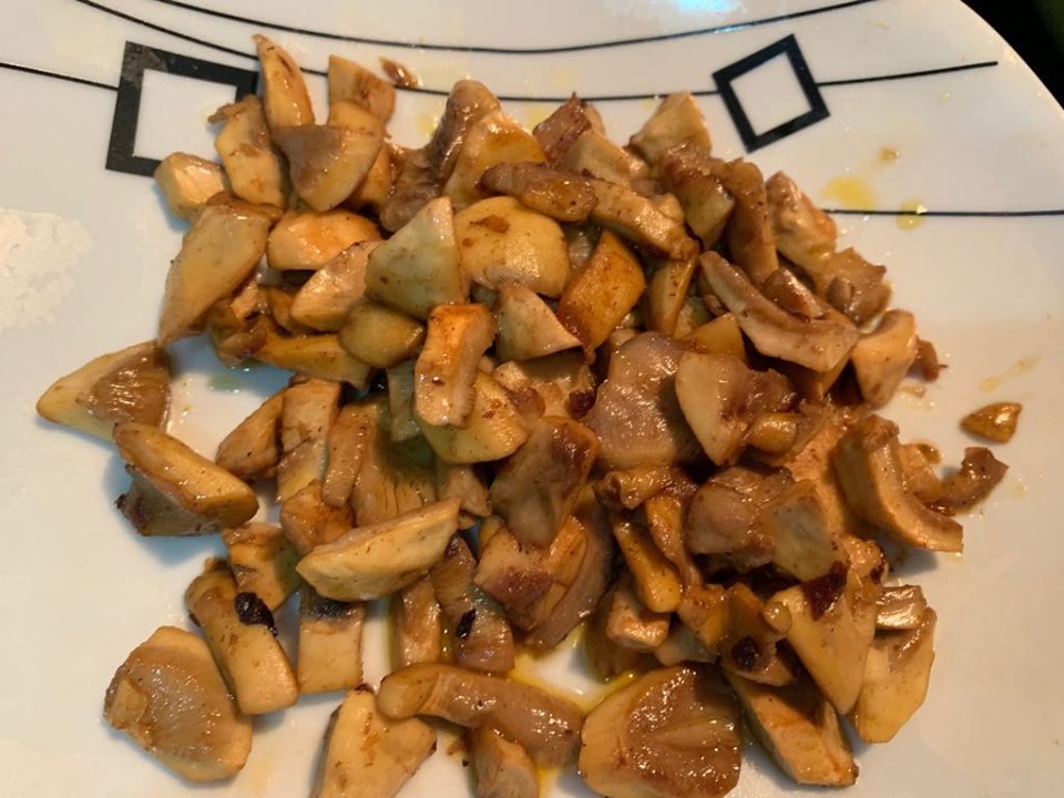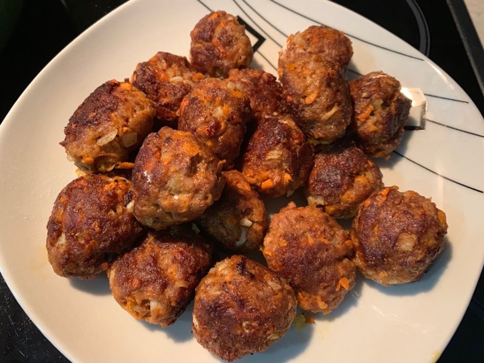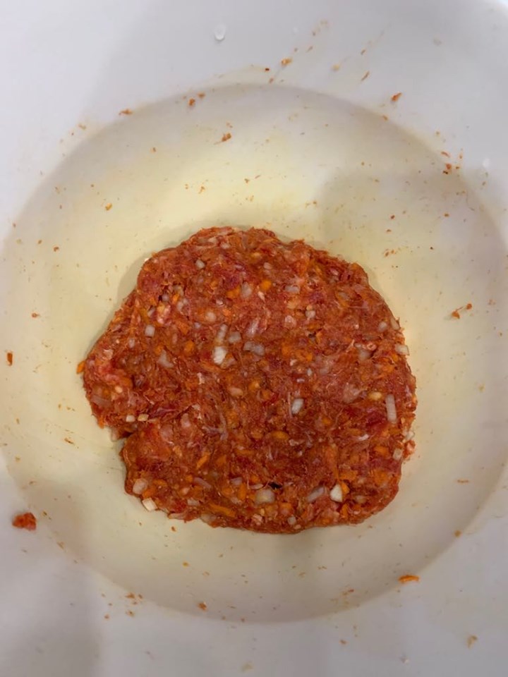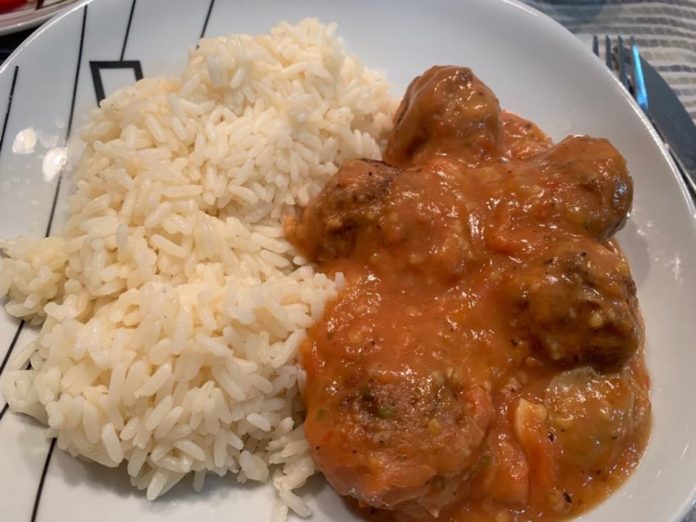 Ndërkohë që e lëmë  orizin të ziejë, përgatisim qoftet. Në një enë të thellë shtojmë mishin e bluar, qepën e grirë imët, karrotën e grirë, vezën, hudhrën, bukën e thërrmuar imët, majdanozin e grirë imët, kripë dhe piperin dhe masën e përziejmë me dorë mirë derisa të jetë një masë homogjene. Pastaj nga kjo masë formojmë topa të cilët i hedhim në tiganin me vaj për ti pjekur. Pjekim mirë qoftet dhe pasi të jenë gati, i heqim nga tigani, ndërsa në të njejtin shtojmë kërpudhat e grira. I fërgojmë edhe ato, pasi të jenë gati i largojmë nga tigani i vendosim në një pijatë dhe në të njejtin tigan shtojmë 4 lugë miell dhe 50gr gjalp dhe 1 lugë caji piper të kuq dhe i përziejmë derisa mielli të fillojë të lëshojë aromën. Pastaj i shtojmë ujë të nxehtë dhe përziejmë vazhdimisht që të mos formohen kokërrza. Shtojmë ujë në mënyrë që masa të mos mbetet e trashë dhe i shtojmë gjithashtu edhe sosin e domatesh. Në të njejtin vend shtojmë qoftet dhe kërpudhat, përziejmë dhe mbulojmë me kap. Këtë e kemi gati. E servojmë në pijatë të shoqëruar me oriz të bardhë të zier.