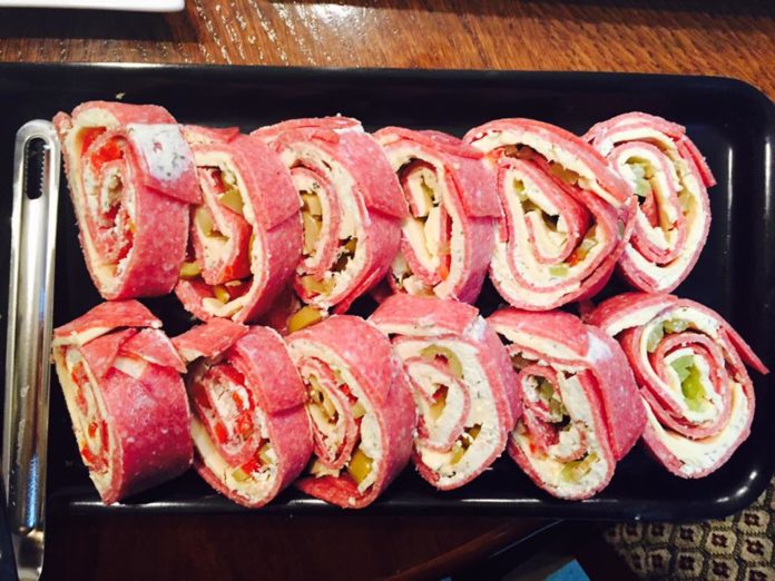 Përbërësit: 2 pako sallamë të thatë, 1 kuti djathë philadelfia, 2 paketime djathë në rriska, specë të kuq dhe të gjelbërt dhe ullinjë.