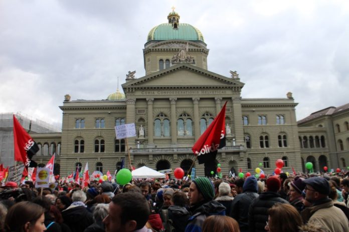 Të shtunën me 1 mars rreth 12’000 persona demonstruan në sheshin federal të Bernës. Manifestimi është ftuar nga mbi 50 organizata. Në fjalimet e tyre krijuesit, migrantët dhe të rinjtë kërkuan marrëdhënie të mira dhe të rregulluara me fqinjët në Evropë si dhe trajtim njerëzor dhe me dinjitet të migranteve e migrantëve në Zvicër. Grupe të ndryshme të njohura muzikore me paraqitjet ne tyre i dhënë mbështetje manifestimit dhe kërkesave të tij.