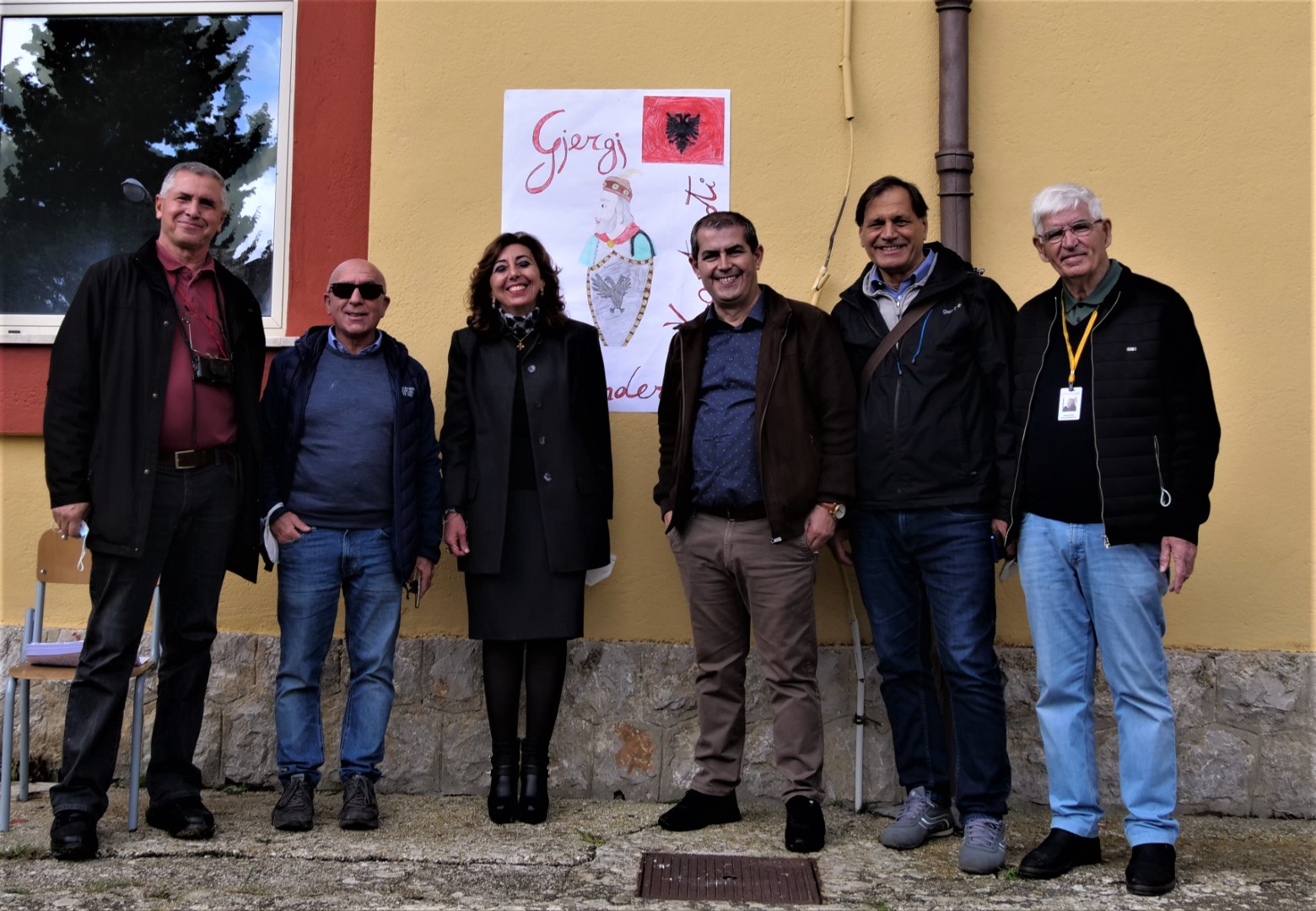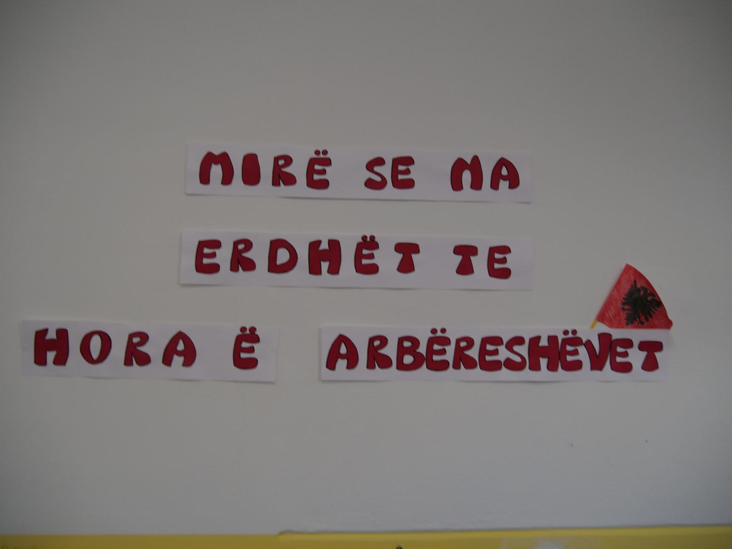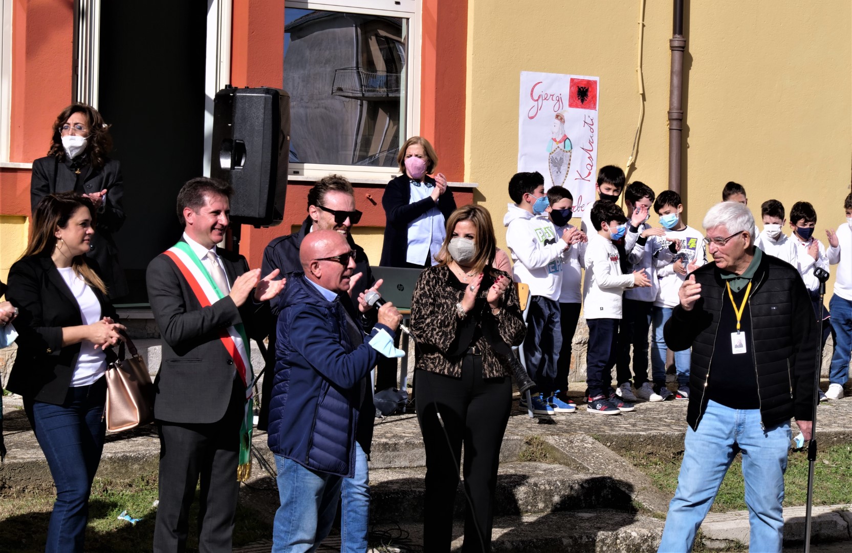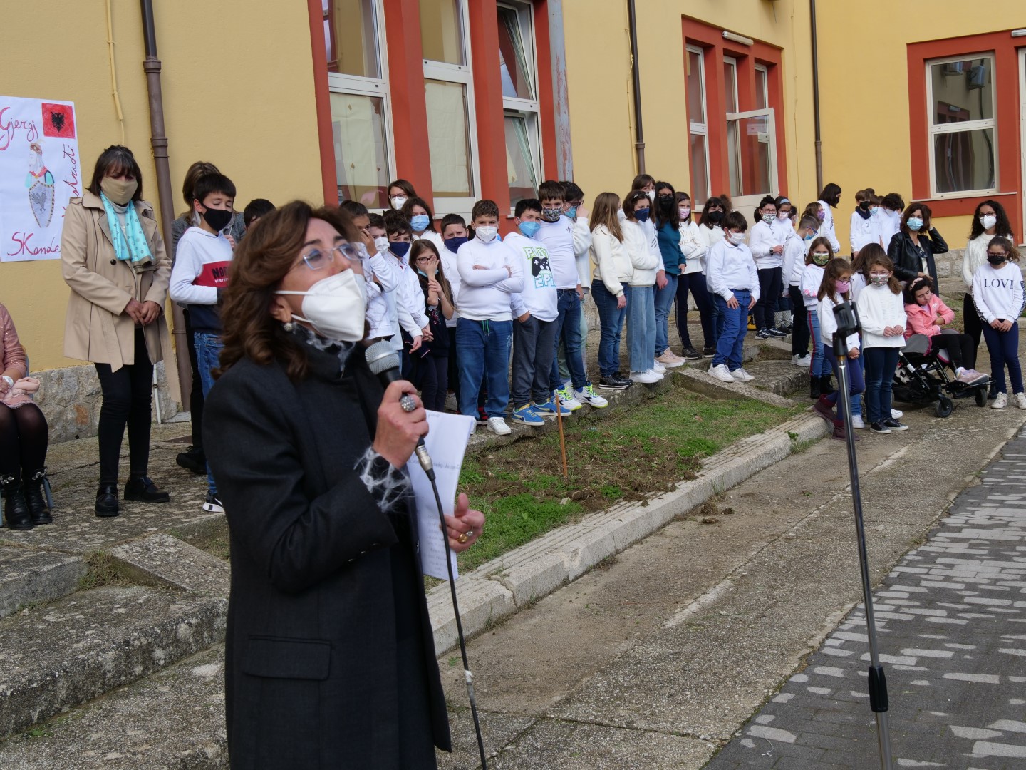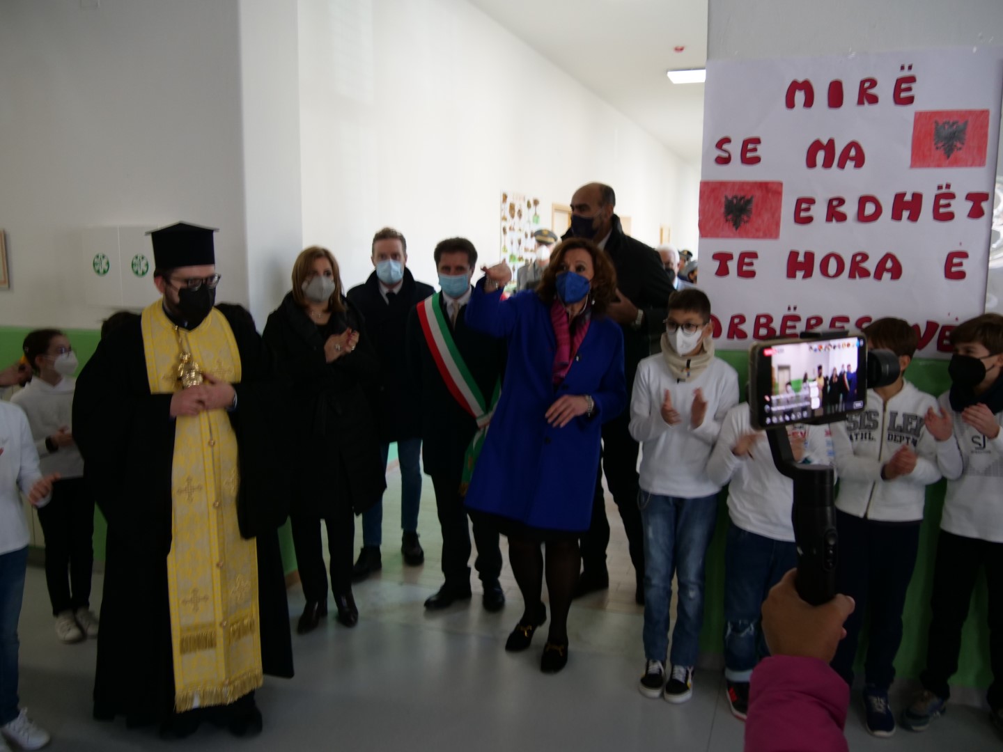 Në fjalën e tij, Kryetari i komunës së Horës së Arbëreshëve ( Piana degli Albanesi), z. Rosario Petta, i veshur në petkun solemn, përplot entuziazëm për motivimin e brezit të ri, pasi që përshëndeti nxënësit dhe mësimdhënësit duke u dëshiruar shumë suksese në mësime, nuk harroi të përshëndes edhe pranin e ekipin tonë. Dhe pasi me këtë rast folën edhe vetë drejtuesit e shkollës “Skandërbeg” dhe mësuesja e mësimit arbërisht, veprimtari i palodhshëm i Horës, Giorgio Cuccia na prezantoi para të pranishmeve, duke më ofruar edhe mua fjalën, meqë rast përgëzova nxënësit, mësimdhënësit dhe autoritetet për suksese të reja me dëshirën që gjuha amtare arbërishtja, gjegjësisht shqipja të ruhet e kultivohet, por edhe që të shtohen këmbimet e vizitave me trojet etnike shqiptare nga trojet stërgjyshore të vet arbëreshëve.