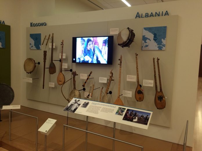 Vëmendjen tonë e tërheq një kënd jo fort i madh i kthinës së madhe të shteteve të Europës (ngase eksponatet janë klasifikuar sipas kontinenteve dhe shteteve të tyre), ku shkruan Kosovo dhe Albania. Aty nuk janë më shumë se 14 eksponate, nga të cilat 13 vegla muzikore dhe 1 vegël pune, furka, për të cilën jepet shpjegimi se puna me të shoqërohet me muzikë karakteristike. Përposhtë secilit instrument muzikor është shënimi me emrin e instrumentit si dhe vendi nga vjen. Për moshën ndërkaq, pothuaj për të gjitha instrumentet thuhet se u përkasin viteve të fundit të shekullit XX.