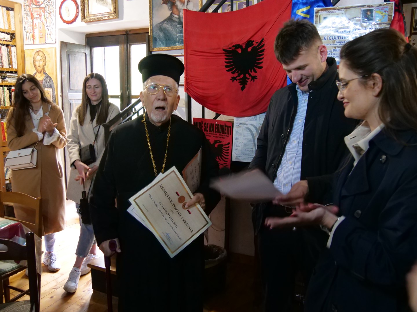 Ndonëse sapo ka dalë nga spitali, Atë Antonio që gjatë kësaj pritjeje kishte vu në ballkonin e shtëpisë së tij flamujt kombëtar, atë të shtetit të Kosovës dhe atë italian, ndërsa që pasi përshëndeti veç e veç çdo studentë dhe vizitorë tjerë, ndër ta edhe Profesor Hazir Mehmetin nga Vjena dhe aktorin Ramadan Morina nga Gjermani që kësaj radhe jemi në shoqërim me studentët, duke i qerosë me bonbona e pije, ju foli atyre për rrugëtimin pesë shekullor të arbëreshëve të cilët ia arritën ta ruajnë identitetin, përfshi gjuhën ritet dhe zakonet, por edhe i luti ata që krahas asaj që të brumosen me arritje të reja shkencore të ruajnë edhe vlerat identitare të të parëve të tyre.