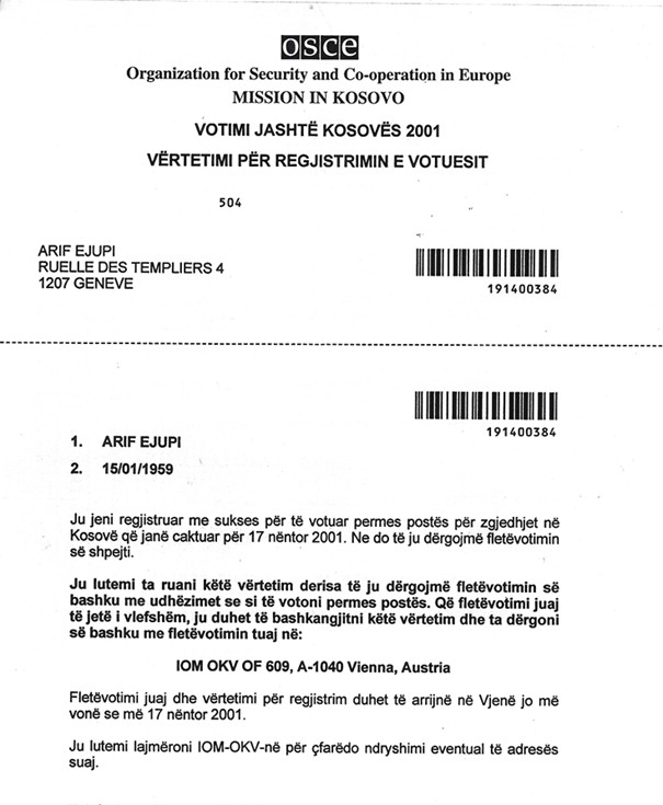 Dëftesa zyrtare e OSBE-së, për votimin me postë të autorit, gjatë zgjedhjeve të pasluftës. Dokument i procedurave të vështira, afateve strikte dhe përkushtimit të diasporës për të kontribuar në proceset demokratike të Kosovës.